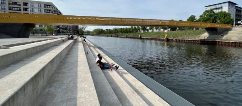 Der Steg überquert den Spandauer Schifffahrtskanal und hebt sich bewusst von den derzeit vorherrschenden, zeitgenössisch schlichten Architekturstilen ab. Die schwarze Sichtbetonbasis von Lichtner-Dyckerhoff bildet dabei einen eleganten Kontrast zu dem goldenen Brückenbogen mit filigranen Aussparungen.