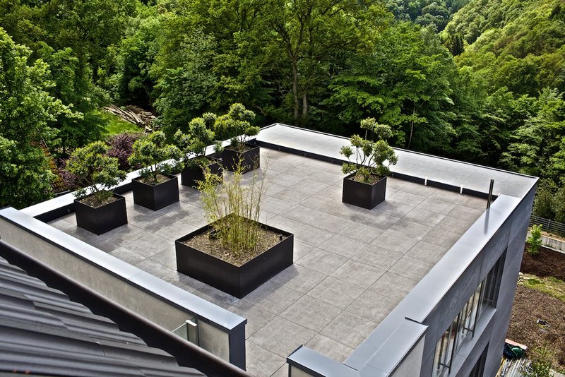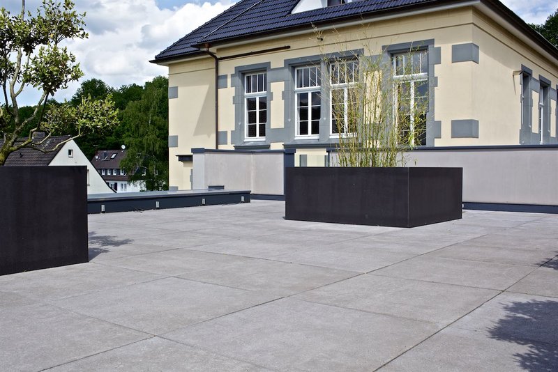 Aufgrund der hohen Bruchlasten ist dies mit unseren armierten Großformaten jederzeit umsetzbar. Sehr schön auch die im gleichen Raster wie unsere Platten verwendeten Pflanzkübel.